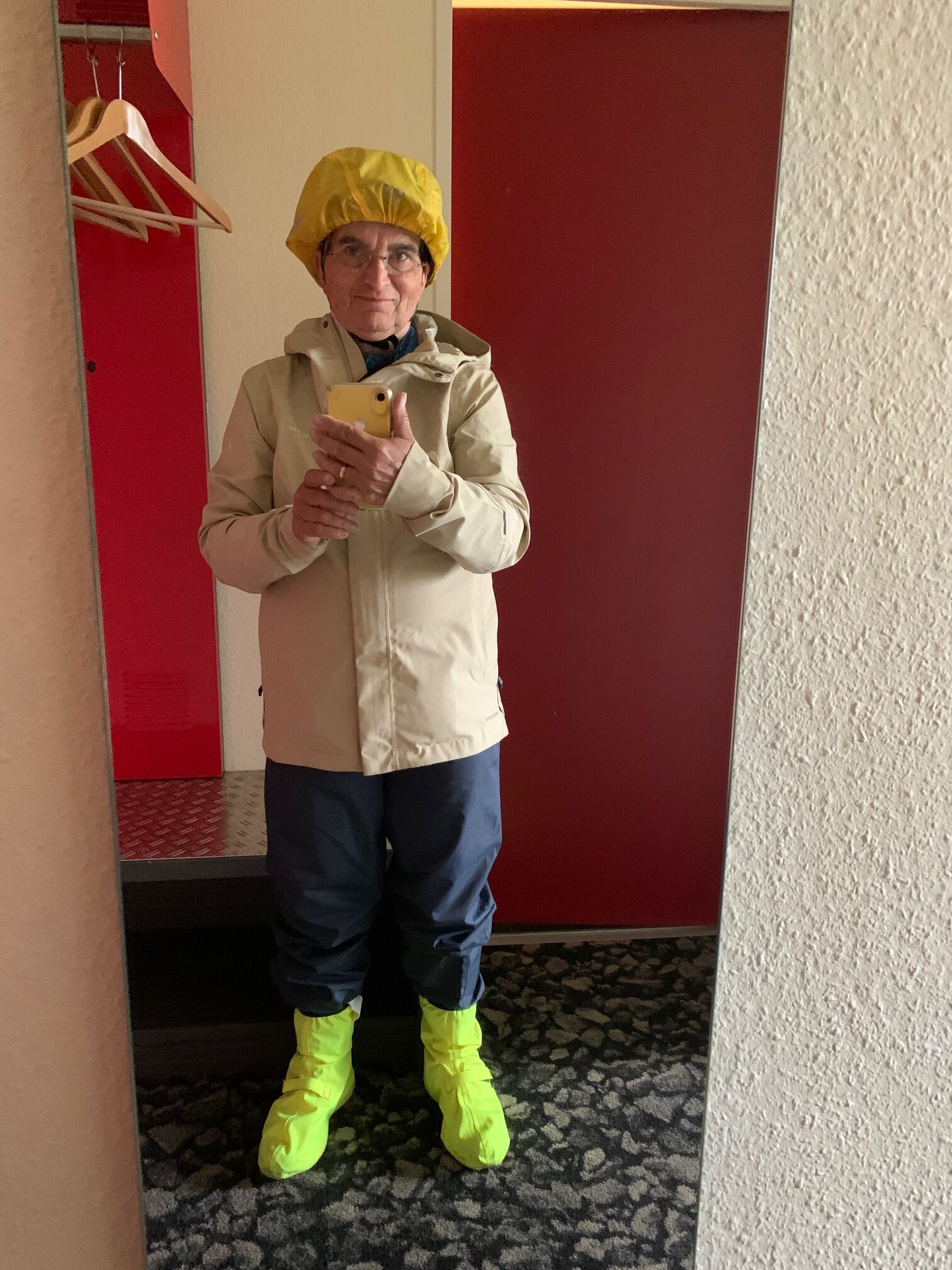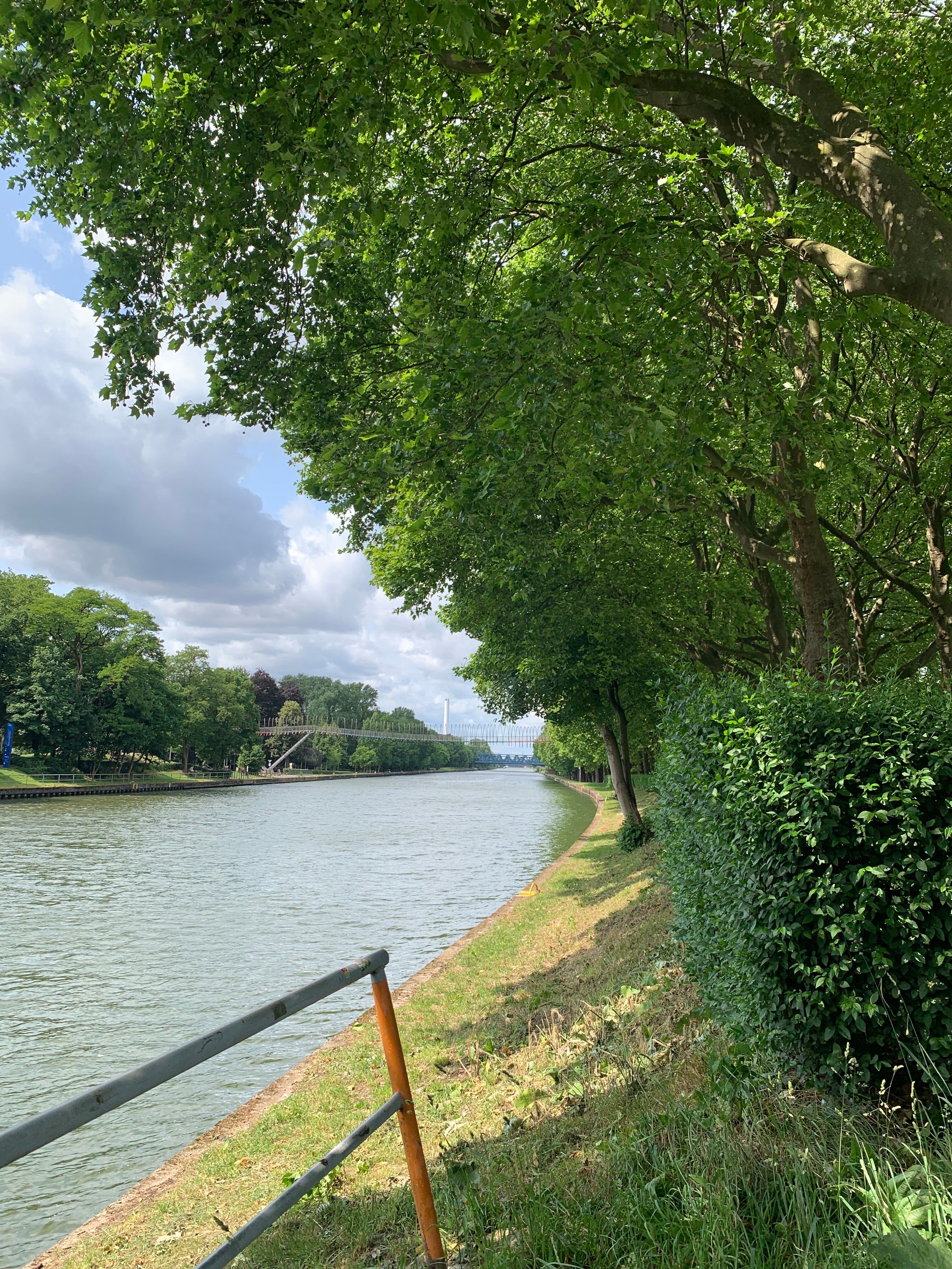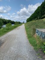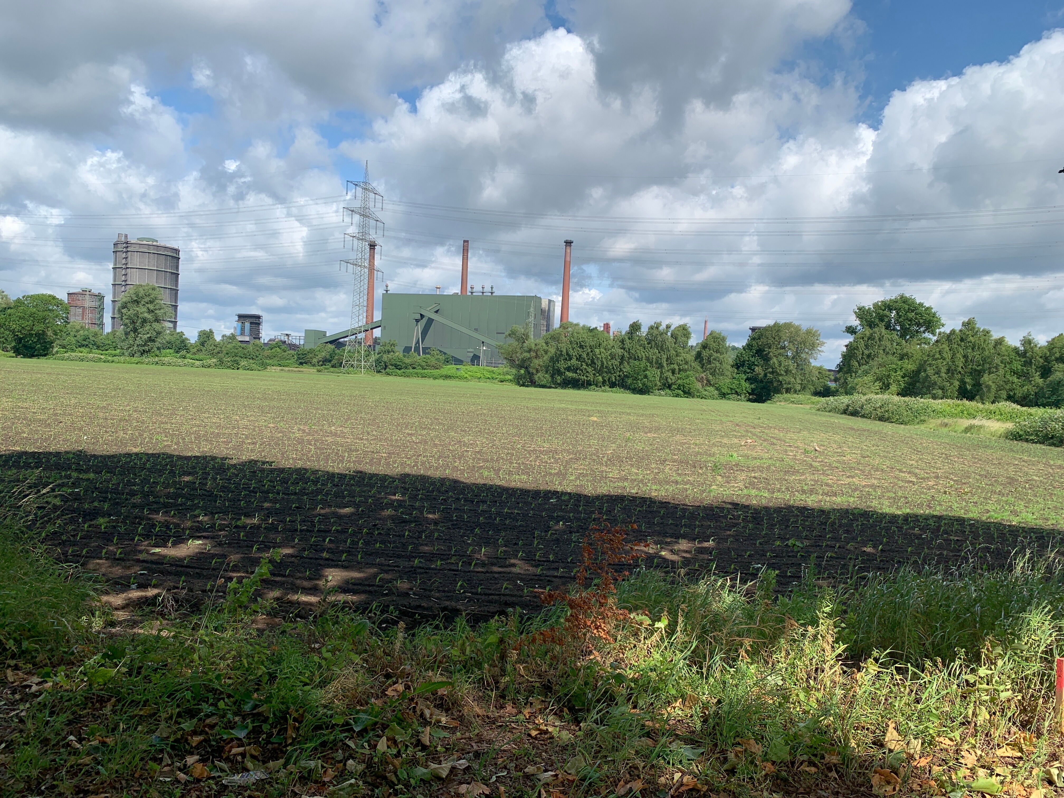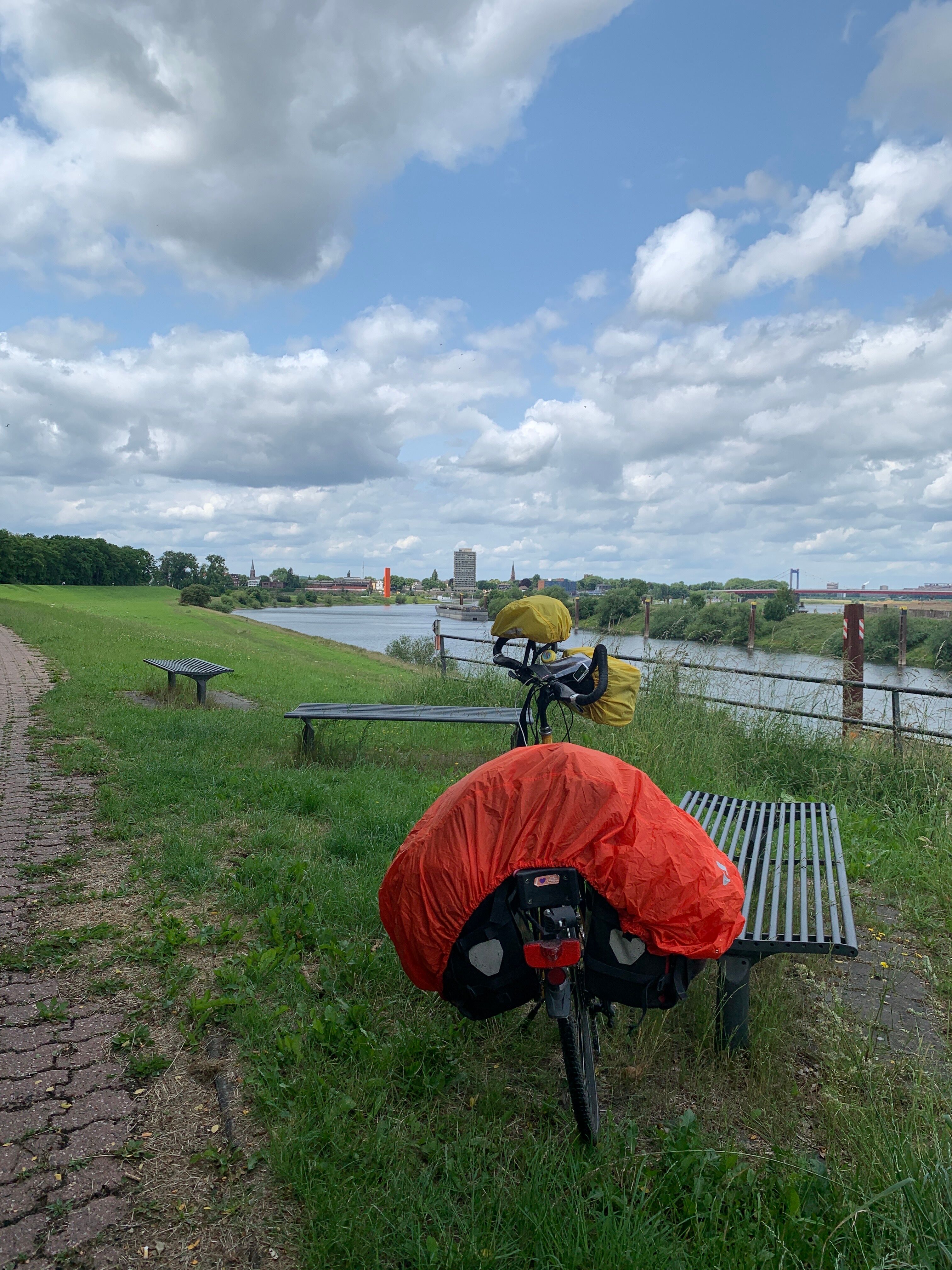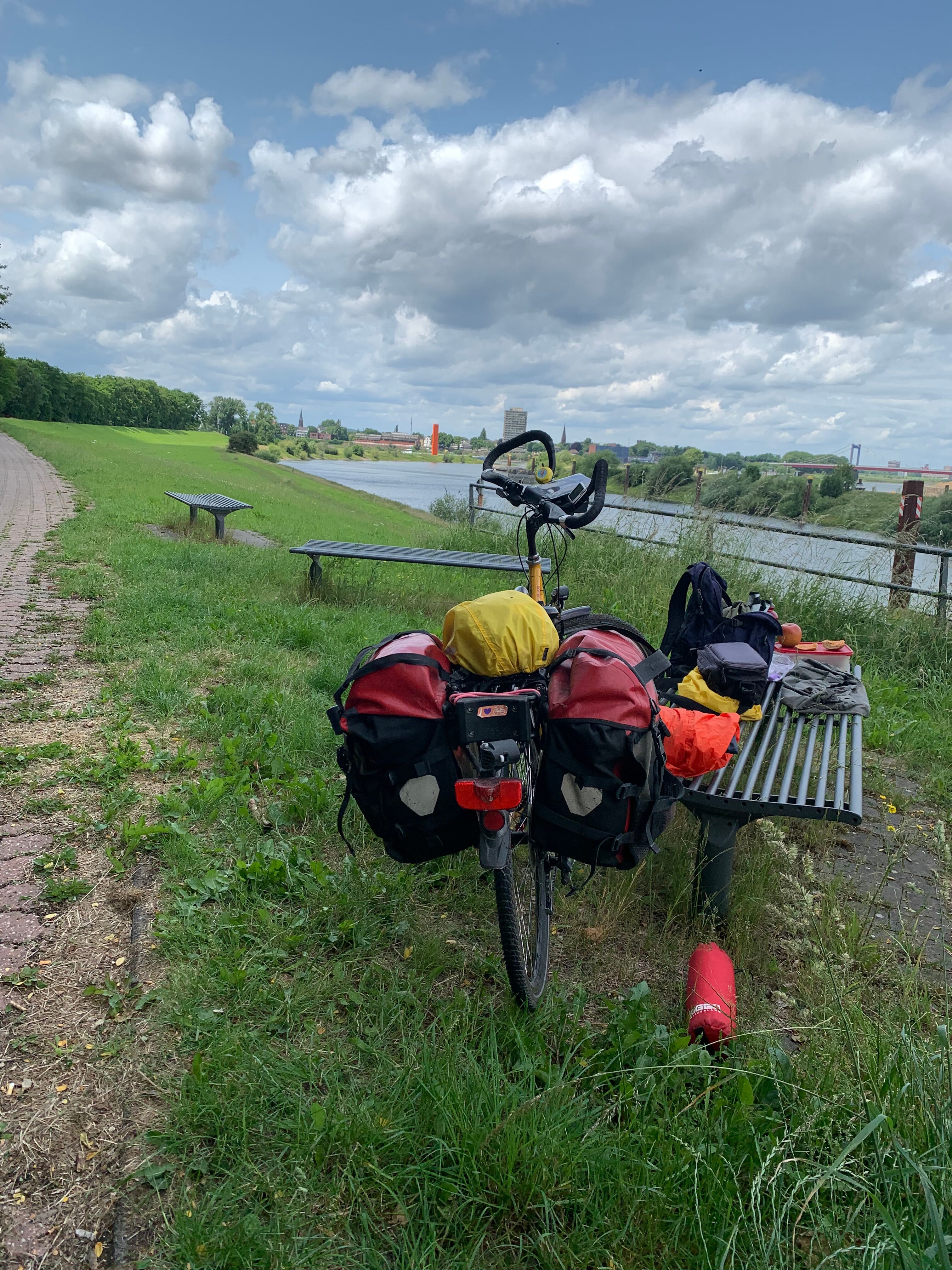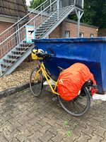 Erstmal kein so gutes Wetter, deshalb mal die Regenklamotten probiert, die ich in Münster gekauft hatte. Von Herten ging es berauf und dann kam das Ortsschild "Gelsenkirchen". An einer Kreuzung habe ich etwas rumgeschaut und eine ältere Dame wollte mir helfen. Da habe ich mal gefragt, ob ich nun "auf Schalke" sein. Sie meinte, da müsse ich noch ein paar Ecken weiter. Aber dann hat sie sich mit mir gefreut, dass diese Radreise so problemlos funktioniert.